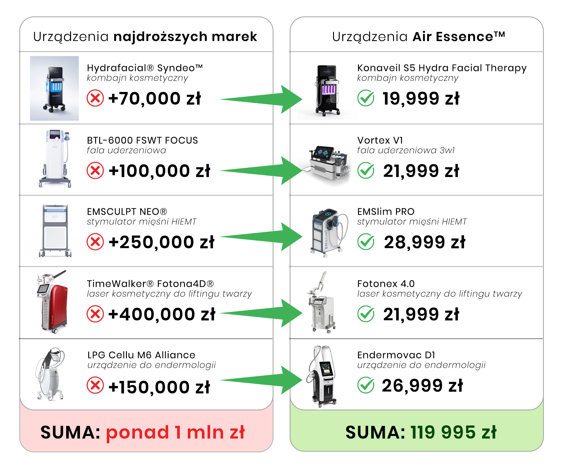 - Endermologia LPG Cellu M6 Alliance: 180 000 – 250 000 zł