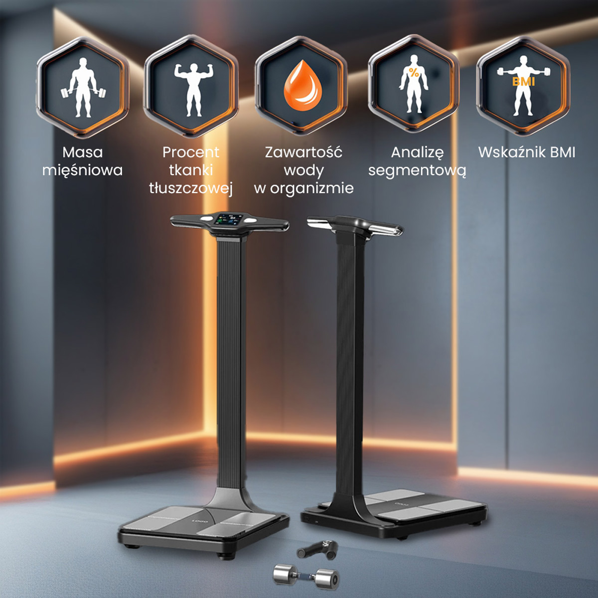• Typ pomiaru: Segmentowa analiza składu ciała (technologia BIA – bioimpedancja elektryczna)
