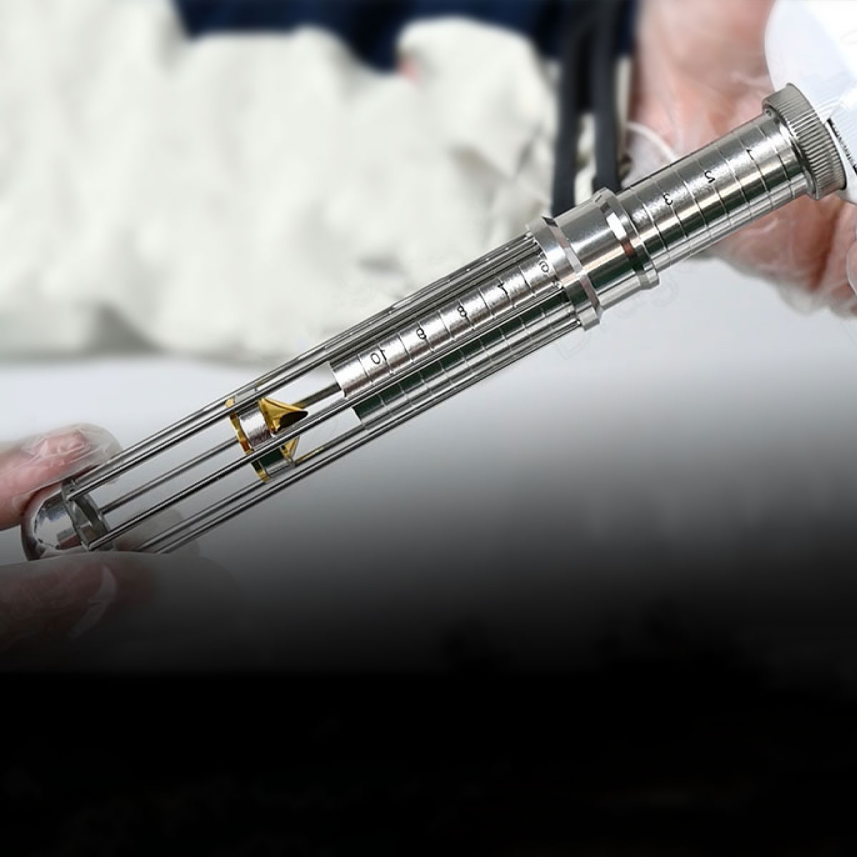System 360° Tightening Tech w laserze Air Essence™ Aramis A1 wykorzystuje złoconą końcówkę zabiegową, która równomiernie rozprowadza energię światła na całej powierzchni zabiegowej.