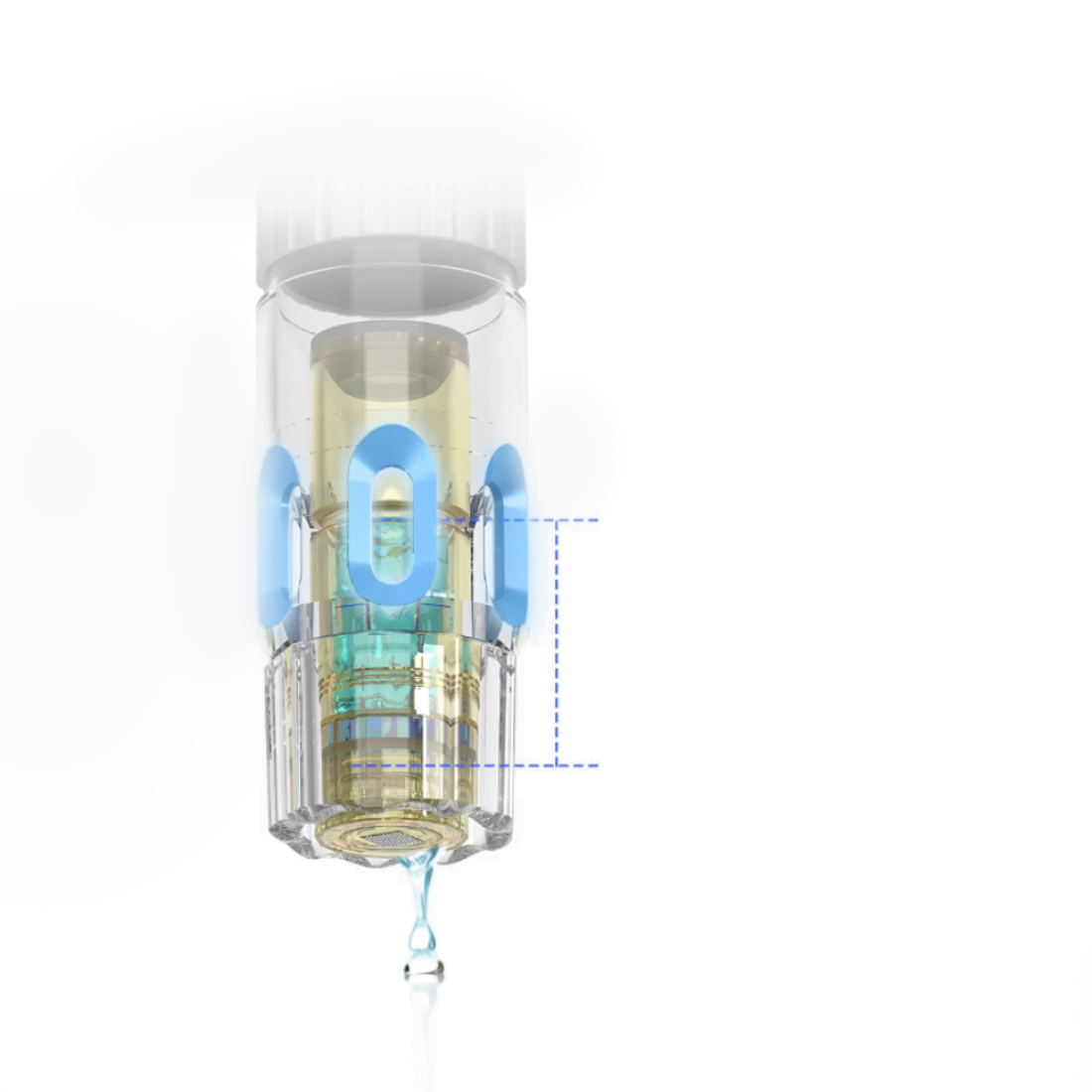 Pojemnik na płyny zabiegowe z wizjerem umożliwia stałą kontrolę ilości aplikowanego preparatu podczas zabiegu, co zwiększa precyzję i komfort pracy. Dzięki bezpośredniemu podawaniu substancji aktywnych skóra jest równomiernie nasycana w trakcie mikronakłuć. Rozwiązanie to minimalizuje straty produktu oraz usprawnia cały proces zabiegowy, podnosząc jego efektywność i higienę.