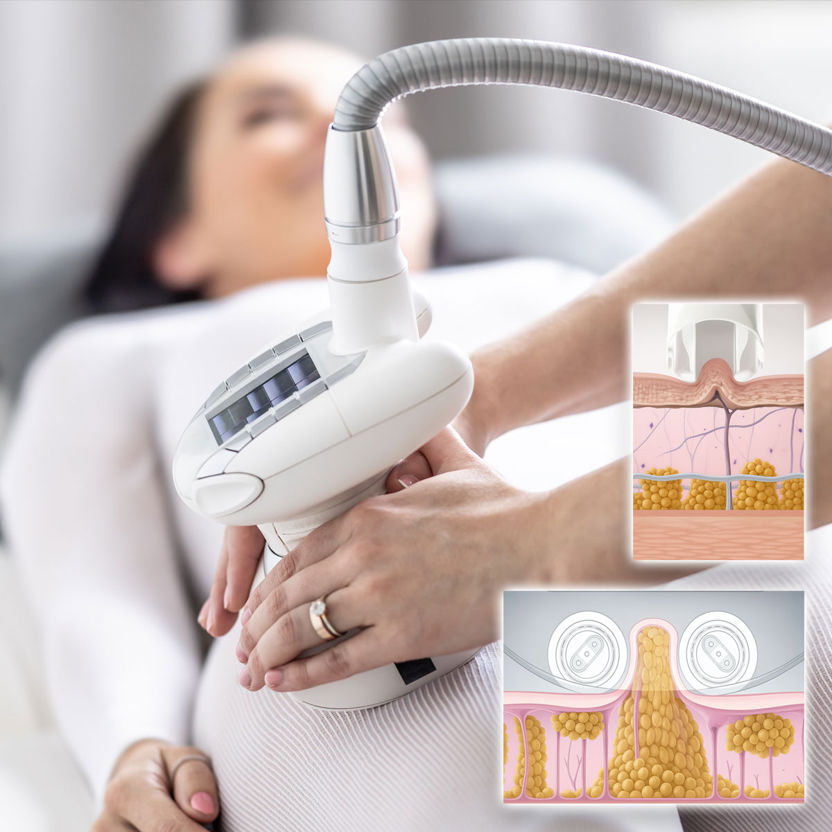 Dzięki takiemu połączeniu urządzenie aktywuje krążenie, metabolizm i regenerację skóry. Zabieg działa głęboko – obejmuje tkankę łączną, tłuszczową, limfatyczną i krwionośną.