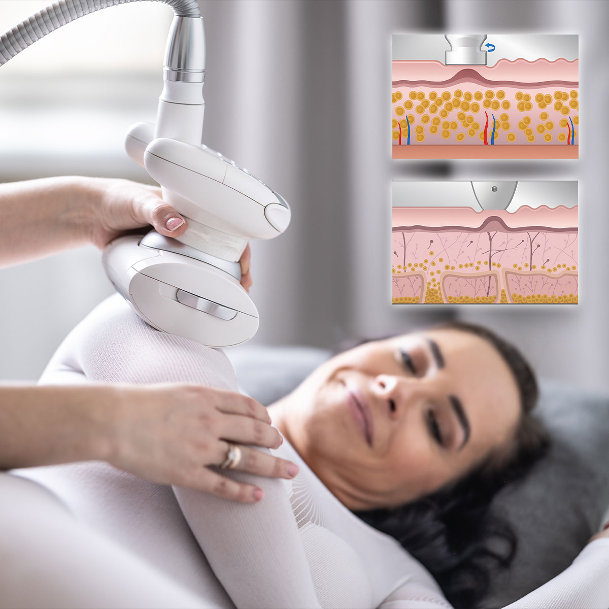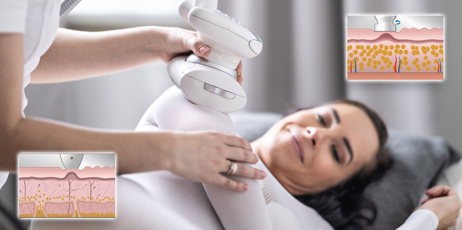 Podgrzewa włókna kolagenowe i tkankę tłuszczową, co prowadzi do redukcji cellulitu i złogów tłuszczu, obkurczenia i przebudowy kolagenu, poprawy jędrności, elastyczności i napięcia skóry. Efekt to widocznie gładsza, napięta skóra i poprawiony owal twarzy.