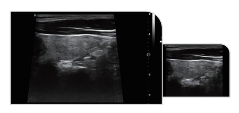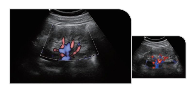 • Funkcja podziału ekranu B/C: dostępna – umożliwia jednoczesne wyświetlanie obrazu B-mode i Color Doppler.