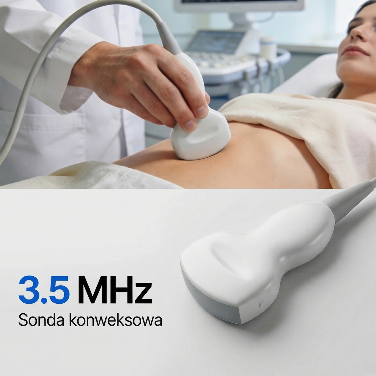 Głowica convex (2.0–5.0 MHz) – uniwersalna, przeznaczona do badań jamy brzusznej i narządów wewnętrznych, o głębokości penetracji do 255 mm.