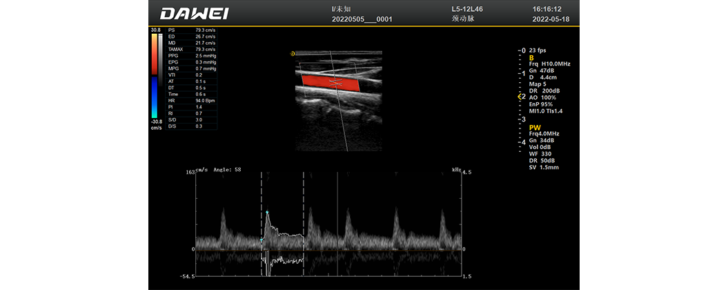 System automatycznie oblicza zmiany szczytowej prędkości przepływu krwi oraz średniej prędkości w czasie, wyświetlając je w czasie rzeczywistym na widmie Dopplera. Dodatkowo automatycznie podaje wskaźniki hemodynamiczne, takie jak ciśnienie, tętno i indeks oporu, wspierając dokładną ocenę przepływu.