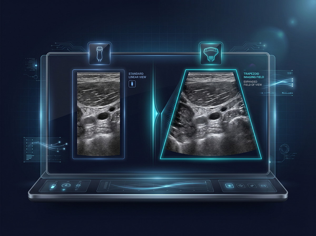 Obrazowanie trapezowe poszerza pole widzenia w badaniu ultrasonograficznym, umożliwiając szerszą prezentację struktur niż w standardowym obrazie liniowym. To praktyczne rozwiązanie, które wspiera ocenę większego obszaru podczas badania i zwiększa komfort pracy diagnostycznej.