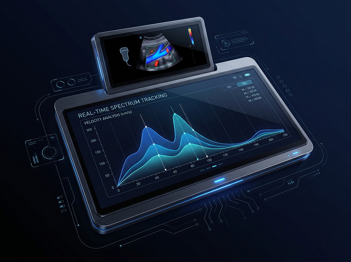 Technologia automatycznego śledzenia i pomiaru widma Dopplera umożliwia automatyczną analizę zmian szczytowej i średniej prędkości przepływu krwi w czasie. Parametry są wyświetlane w czasie rzeczywistym na widmie Dopplera, co wspiera szybką ocenę hemodynamiczną i usprawnia codzienną pracę podczas badań naczyniowych oraz kardiologicznych.