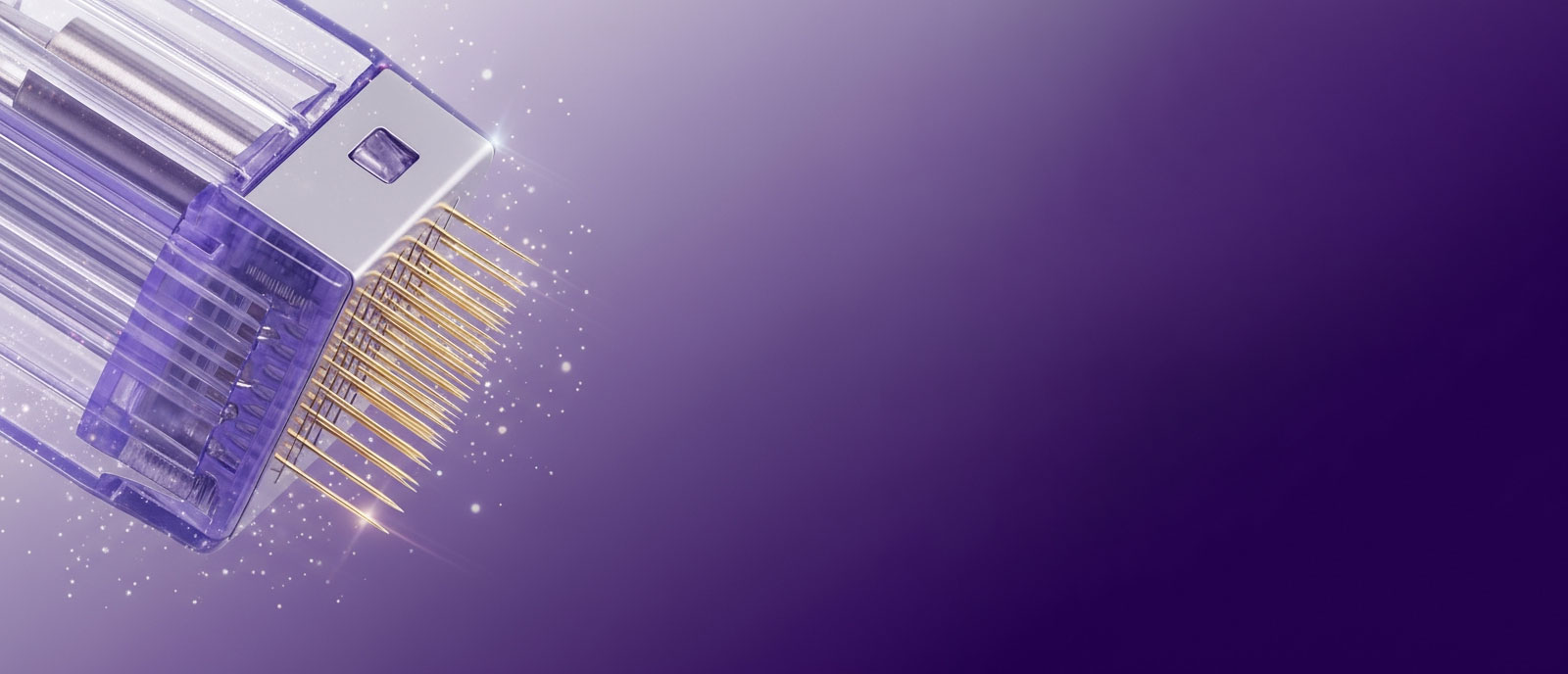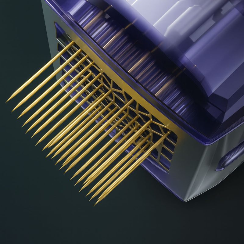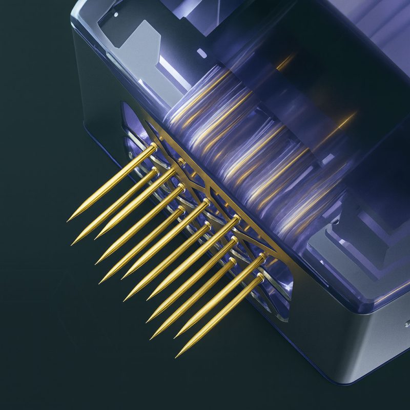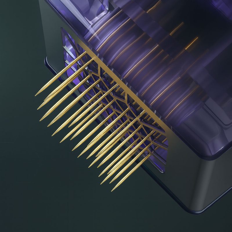 Igły o stożkowym szlifie i izolowanej powłoce kierują energię dokładnie tam, gdzie jest potrzebna, ograniczając podrażnienia naskórka. Pozłacana powierzchnia i bardzo mała średnica trzonu (ok. 0,22 mm) zapewniają gładkie wejście igły, większy komfort zabiegu oraz wysokie bezpieczeństwo i powtarzalność efektów.