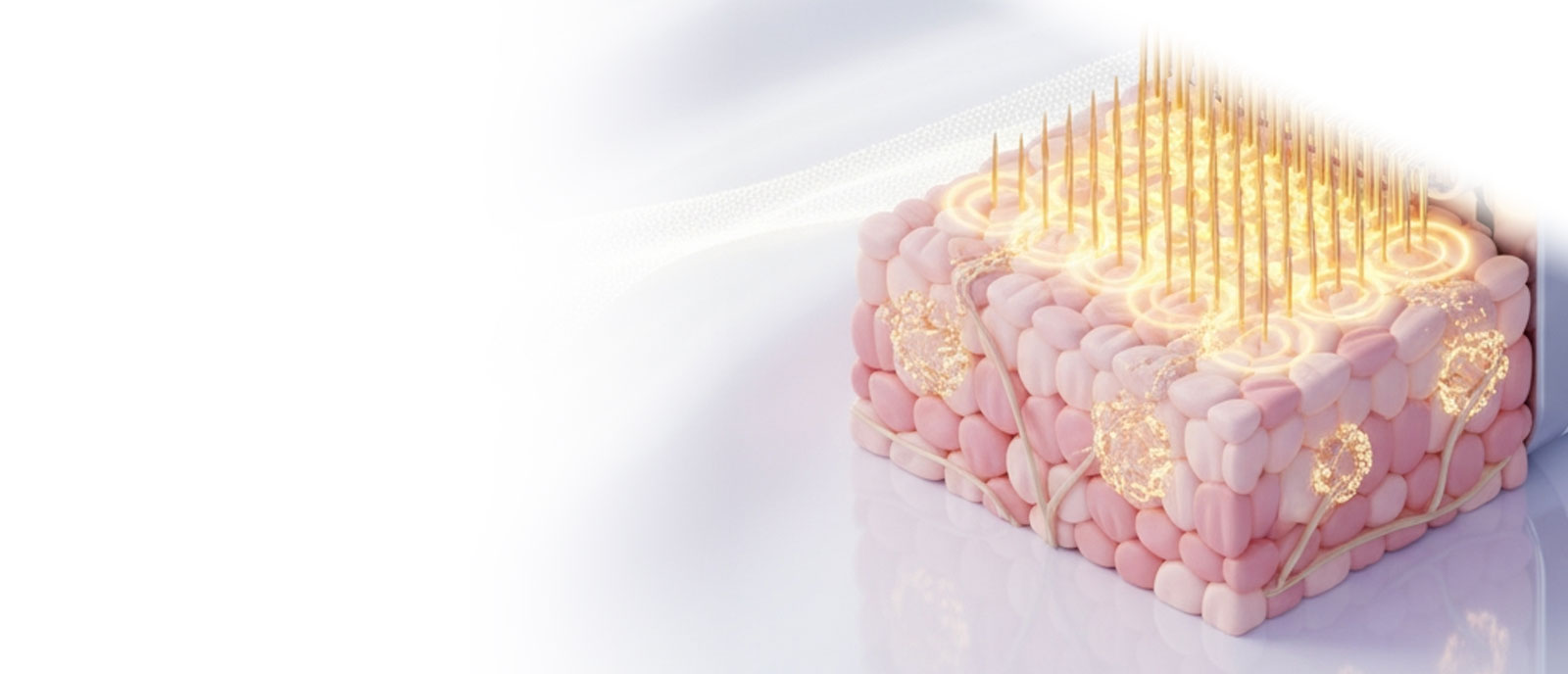 Precyzyjnie dostarczane impulsy energii RF aktywują fibroblasty, przyspieszając produkcję kolagenu i elastyny.