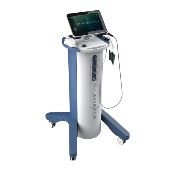 • Fala uderzeniowa Air Essence™ MixCool PRO1 to biało-czarne urządzenie 3w1 na kółkach, z ekranem dotykowym, oferujące skoncentrowaną terapię elektromagnetyczną falą uderzeniową, kriolipolizę i rolkę masującą RF do pielęgnacji skóry lub zabiegów kosmetycznych.