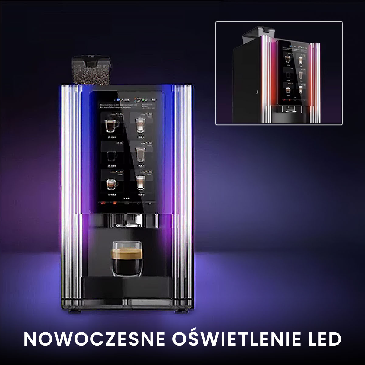 ✔ Personalizacja oświetlenia – Możliwość dostosowania kolorystyki sprawia, że ekspres doskonale wpisuje się w wystrój wnętrza, przyciągając uwagę klientów i dodając charakteru każdemu miejscu.