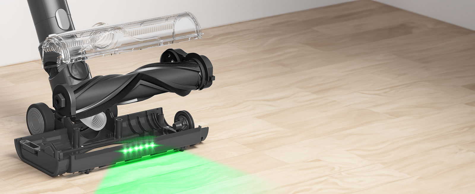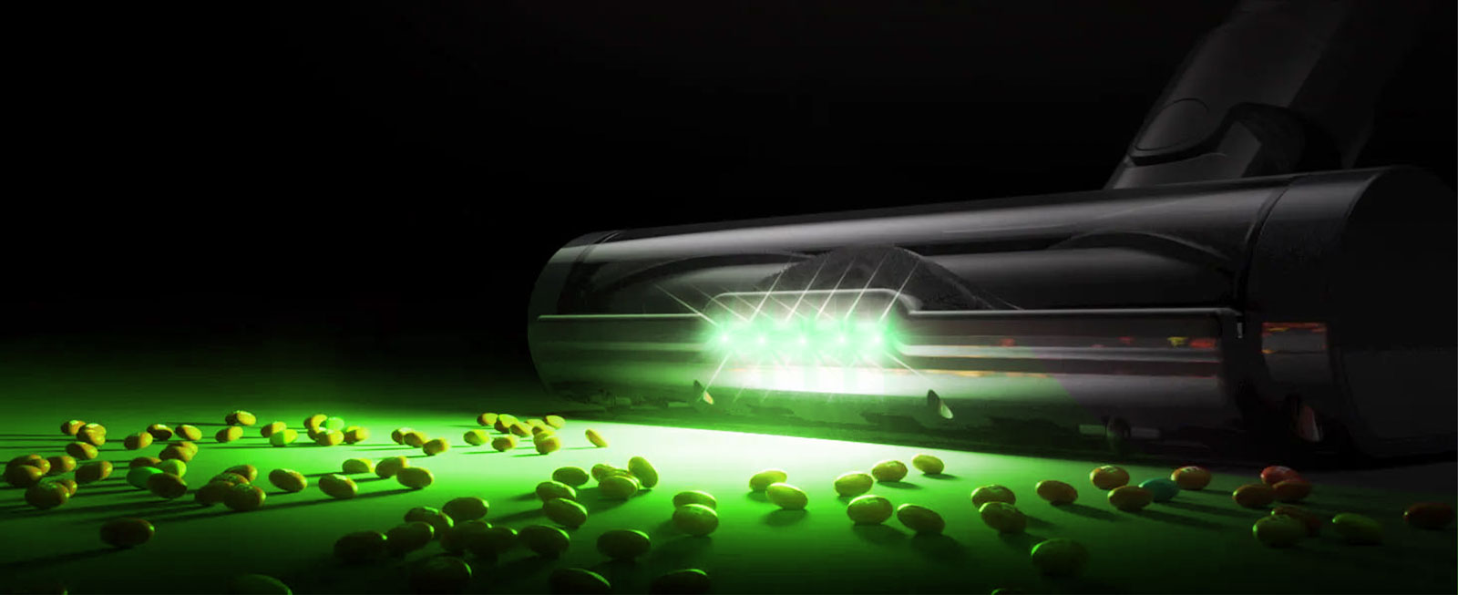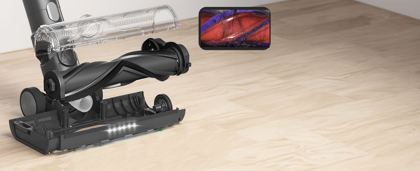 Dzięki zastosowaniu jasnego podświetlania na przedniej części szczotki znacznie dokładniej odkurzysz zakamarki i ciemne miejsca pod łóżkiem czy meblami.