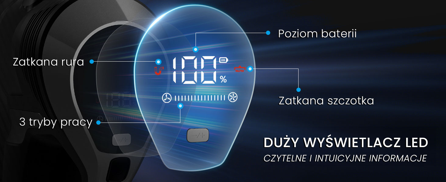 Bezprzewodowy odkurzacz Air Essence Bise PRO iQFlex został wyposażony w innowacyjny, wszechstronny wyświetlacz LED, który umożliwia odczyt w czasie rzeczywistym: