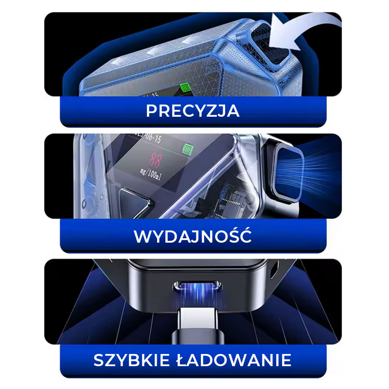 Wykorzystanie zaawansowanych technologii oraz funkcja szybkiego ładowania to cechy, które znacząco wyróżniają ten alkomat na tle konkurencyjnych urządzeń.