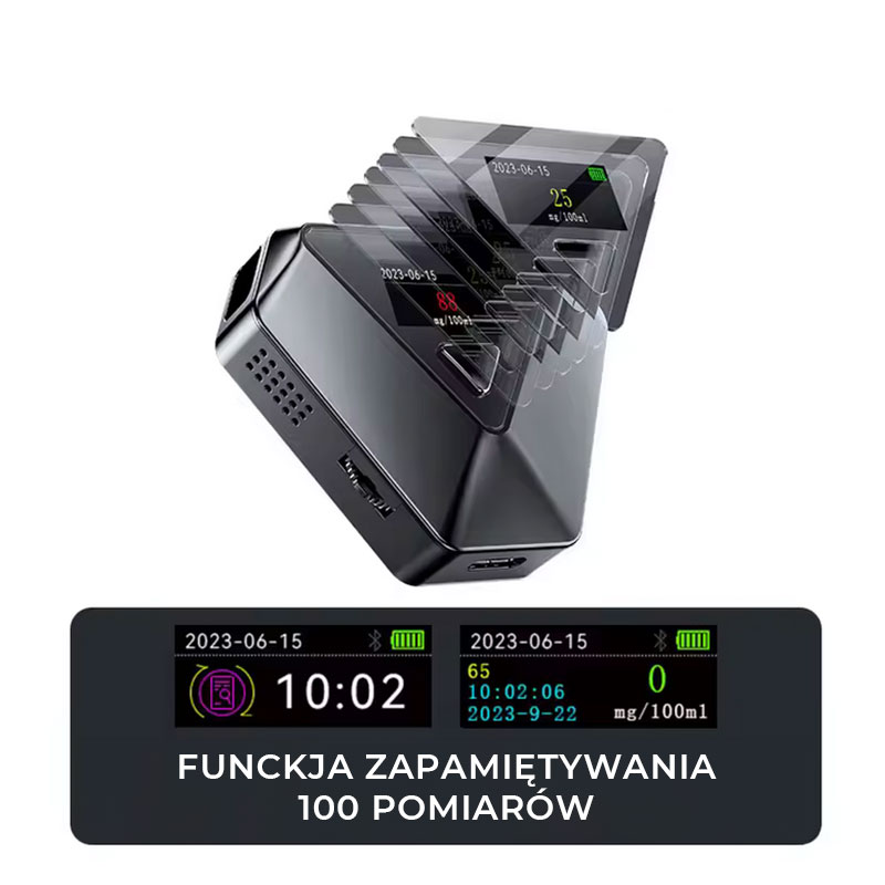 Alkomat posiada funkcję zapisu wyników, dzięki której możesz przechowywać i przeglądać historię aż 100 testów.