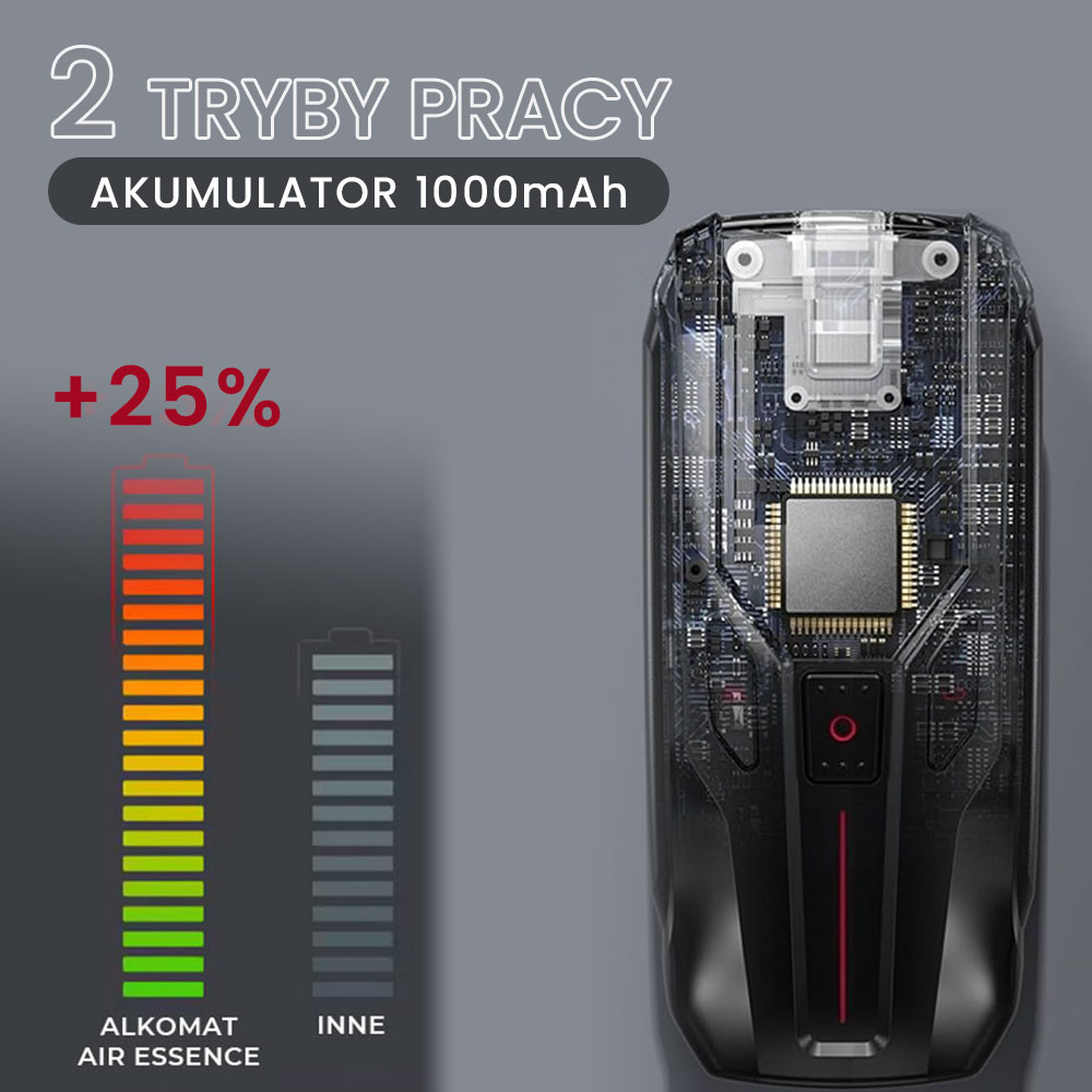 Cyfrowy alkomat został wyposażony w akumulator o pojemności 1000mAh, co zapewnia długotrwałe użytkowanie bez konieczności częstego ładowania.