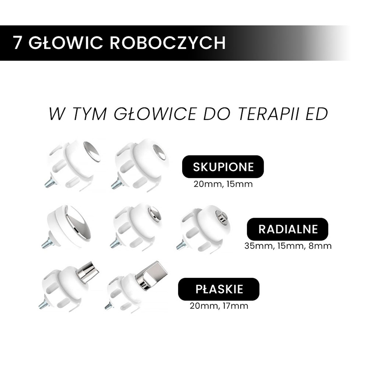- Końcówki radialne – o średnicach 15 mm i 20 mm, stworzone do leczenia większych obszarów mięśniowych.