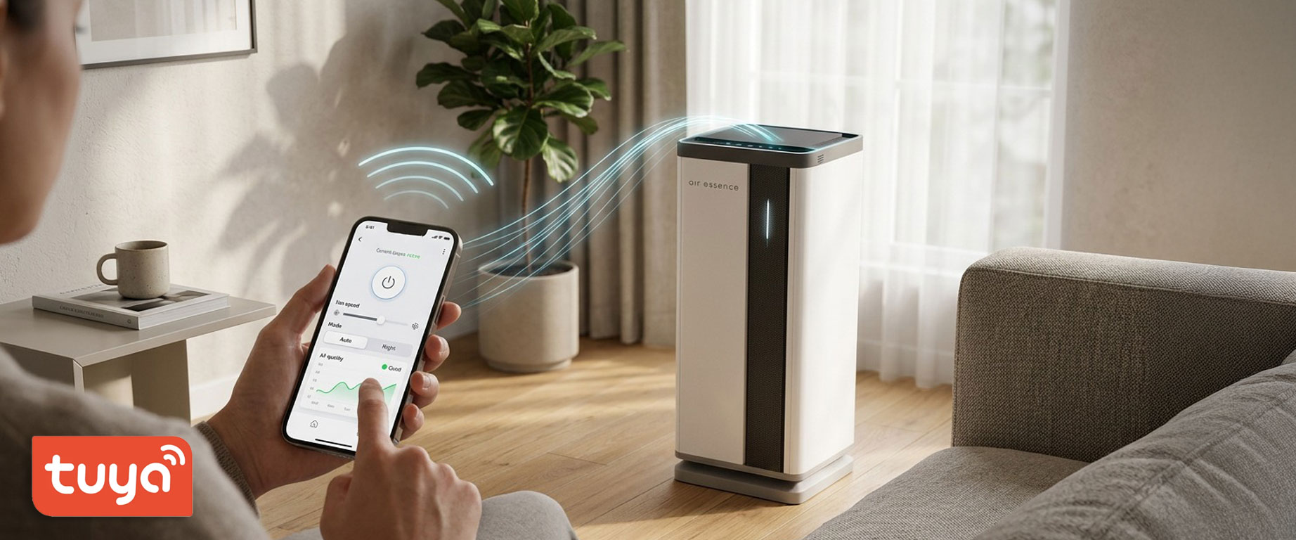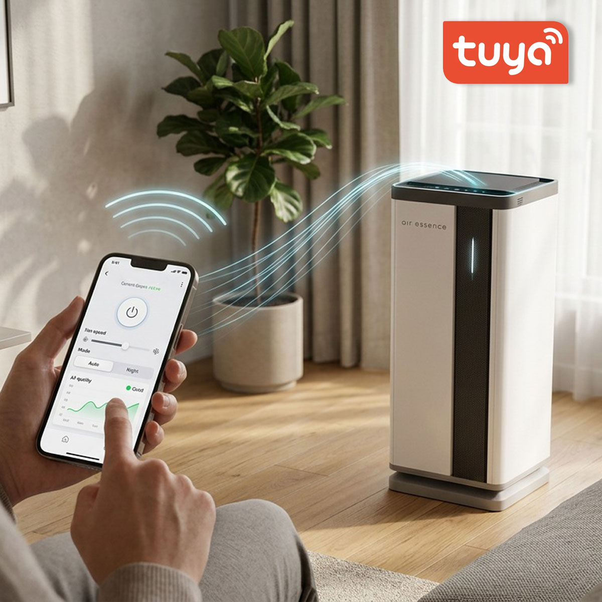 Aplikacja Tuya zapewnia zdalną możliwość sterowania oczyszczaczem. Po połączeniu z siecią Wi-Fi zyskujesz dostęp do najważniejszych funkcji urządzenia m.in. włączania i wyłączania, zmiany trybów pracy, regulacji prędkości czy ustawiania timera.