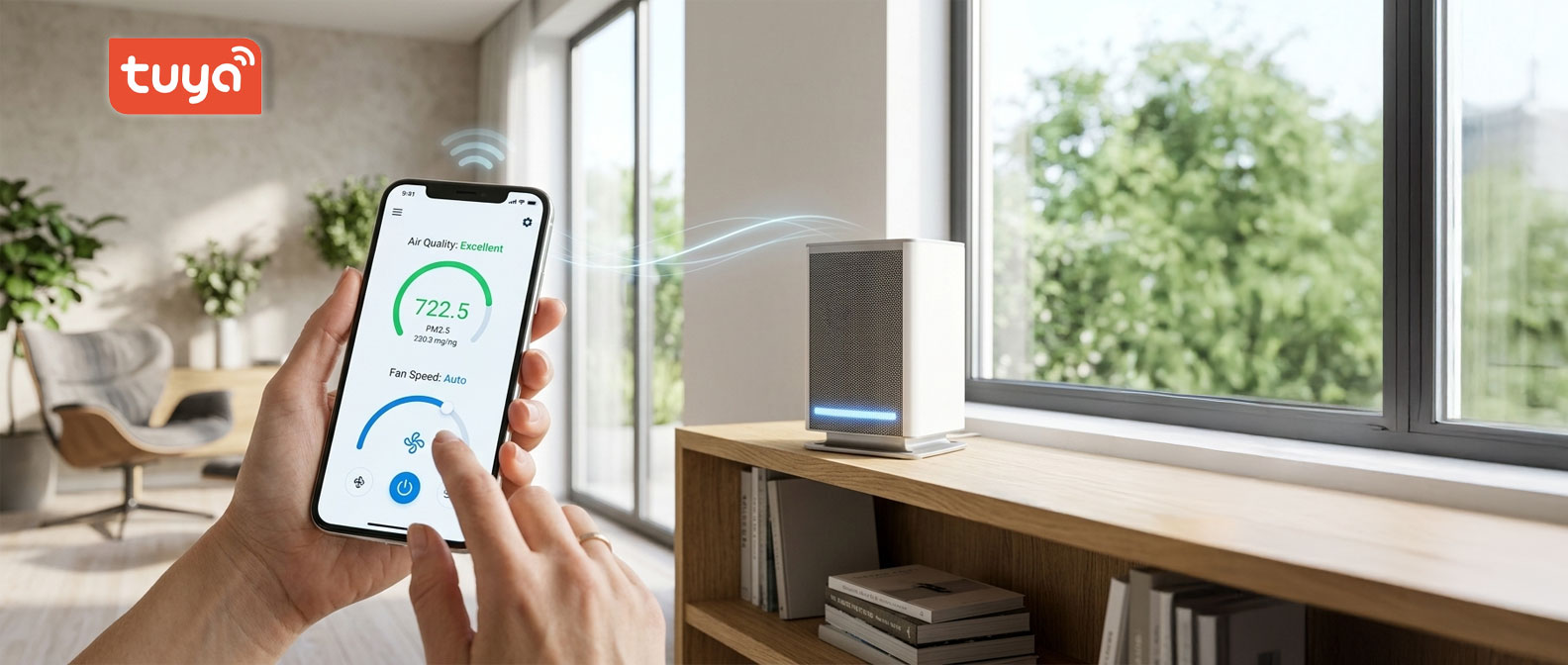 Aplikacja Tuya zapewnia zdalną możliwość sterowania oczyszczaczem. Po połączeniu z siecią Wi-Fi zyskujesz dostęp do najważniejszych funkcji urządzenia m.in. włączania i wyłączania, zmiany trybów pracy, regulacji prędkości czy ustawiania timera. Aplikacja pozwala także monitorować aktualną jakość powietrza oraz kontrolować ustawienia w czasie rzeczywistym.