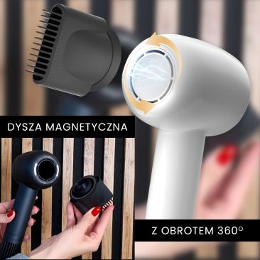 Innowacyjna dysza magnetyczna obraca się o 360°, zapewniając niezrównaną wygodę w użytkowaniu. Ta unikalna funkcja umożliwia łatwe i szybkie założenie oraz zdjęcie dyszy, co znacząco ułatwia proces stylizacji włosów. Obrotowa dysza pozwala na precyzyjne kierowanie strumienia powietrza, co jest kluczowe dla osiągnięcia idealnego efektu suszenia i modelowania fryzury.