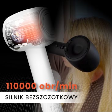 Prędkość urządzenia jest 5-6 razy większa niż w przypadku standardowych suszarek, dzięki czemu znacząco skraca czas suszenia włosów.
