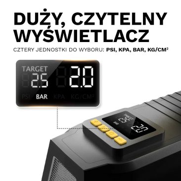 Automatyczne zatrzymanie pompowania po osiągnięciu zadanego ciśnienia. Pompka posiada wbudowaną latarkę LED podnoszącą komfort i bezpieczeństwo podczas pracy przy kołach.