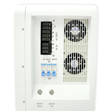 Wyposażony jest w kompletny zestaw złącz i przełączników, które umożliwiają szybkie podłączenie systemu do instalacji fotowoltaicznej (wejścia PV+ i PV-), sieci energetycznej (AC IN) oraz odbiorników prądu (AC OUT). Zintegrowane przełączniki AC oraz wyłączniki baterii i inwertera zapewniają wygodne i bezpieczne sterowanie pracą urządzenia.