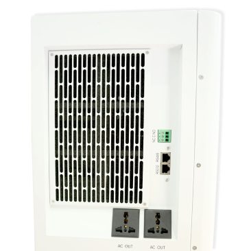 Dodatkowo panel posiada porty komunikacyjne RS232 (inwerter) oraz RS485 (BMS), umożliwiające integrację z systemami monitoringu i sterowania. Wbudowane styki bezpotencjałowe (NO, NC, C) pozwalają na współpracę z zewnętrznymi systemami automatyki. Konstrukcja obejmuje również wydajny system wentylacji z kratkami i wentylatorami, a podwójne gniazda wyjściowe AC w standardzie trójkątnym umożliwiają równoczesne zasilanie wielu urządzeń.