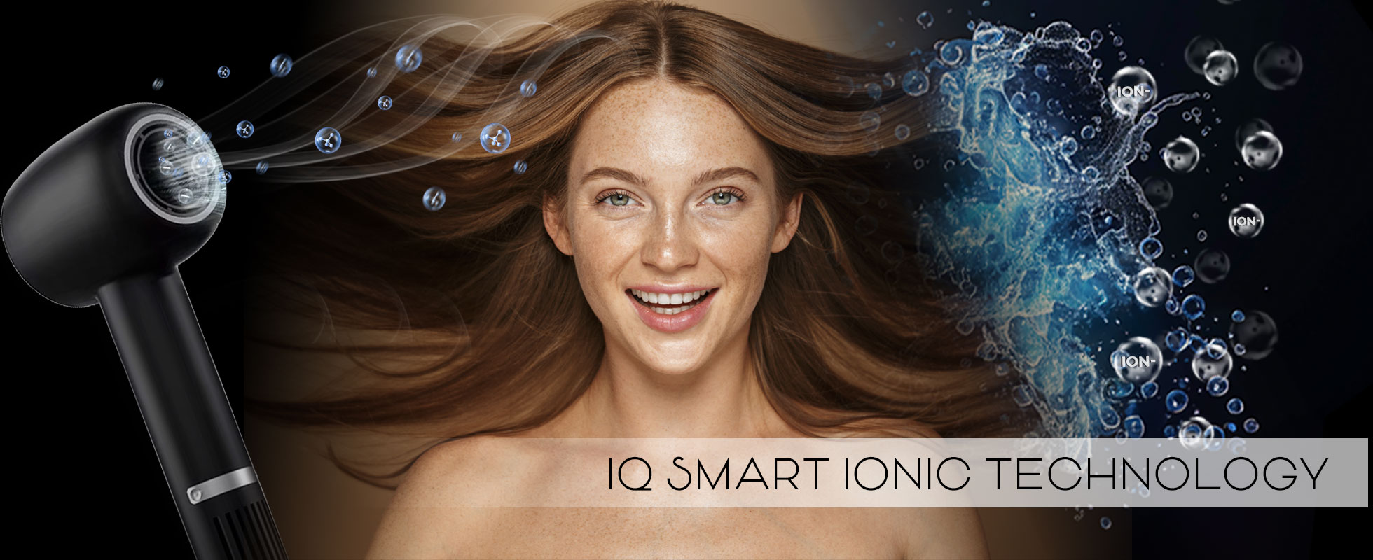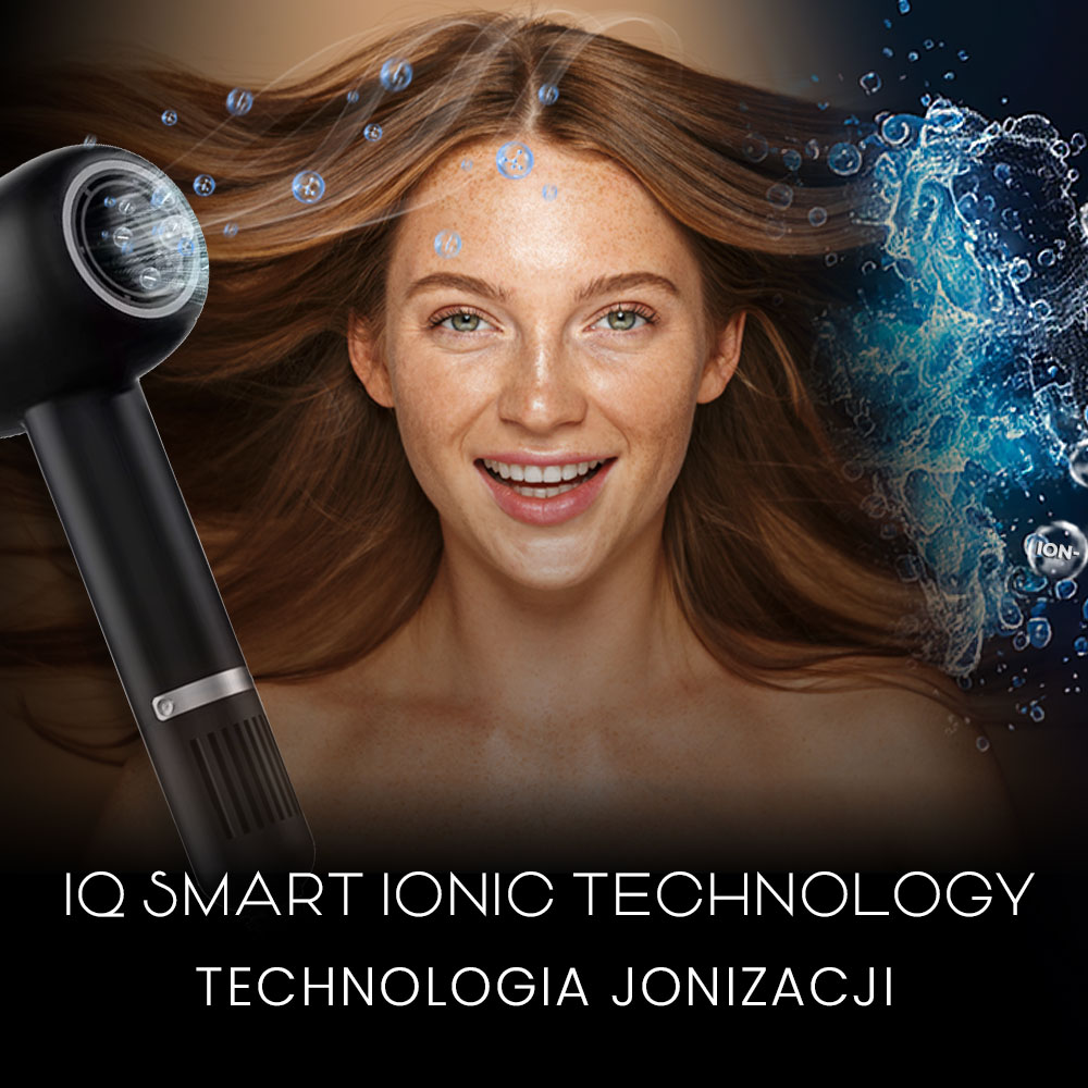 Suszarka wyposażona w technologię iQ Smart Ionic, generującą 300 milionów jonów ujemnych, stanowi przełom w procesie stylizacji włosów. Inteligentny system iQ precyzyjnie dostosowuje wydajność jonów ujemnych, co skutecznie równoważy statyczną elektryczność we włosach, zapobiegając ich puszeniu się i zamykając wilgoć wewnątrz włókien włosowych.