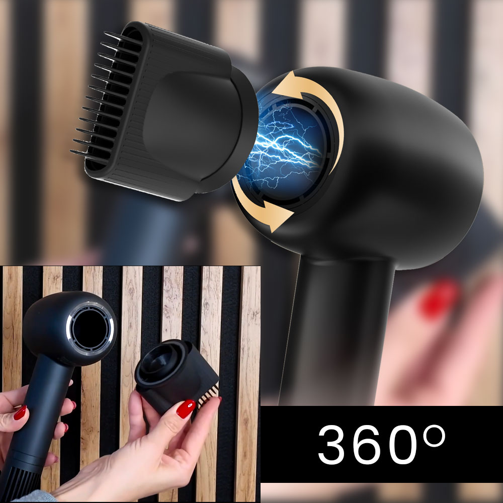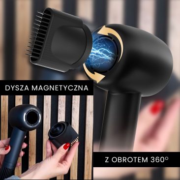 Innowacyjna dysza magnetyczna obraca się o 360°, zapewniając niezrównaną wygodę w użytkowaniu. Ta unikalna funkcja umożliwia łatwe i szybkie założenie oraz zdjęcie dyszy, co znacząco ułatwia proces stylizacji włosów. Obrotowa dysza pozwala na precyzyjne kierowanie strumienia powietrza, co jest kluczowe dla osiągnięcia idealnego efektu suszenia i modelowania fryzury.