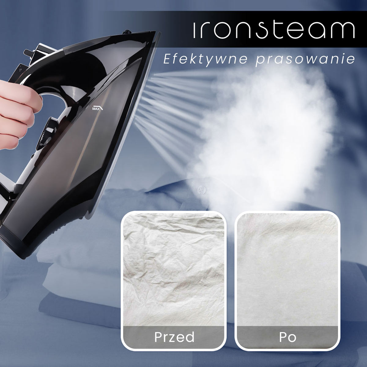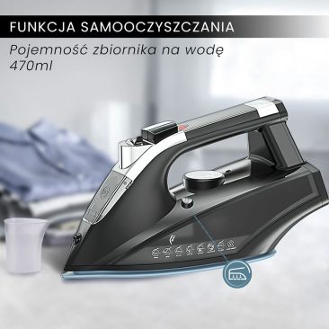 Żelazko wyposażono w funkcję samooczyszczania, która skutecznie usuwa osady wapienne i inne zanieczyszczenia, dbając o sprawność urządzenia przez długie lata.