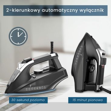 2-kierunkowy automatyczny wyłącznik, zapewnia pełne bezpieczeństwo podczas użytkowania. Jeśli urządzenie pozostanie w pozycji poziomej bez ruchu przez 30 sekund, wyłączy się automatycznie, eliminując ryzyko przypalenia tkaniny. W przypadku pozostawienia żelazka w pozycji pionowej, wyłącznik uruchomi się po 15 minutach.